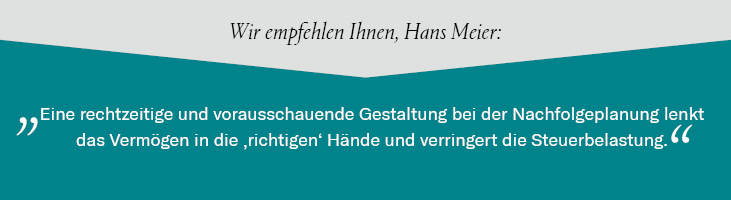 „Ich möchte meine Nachfolge planen. Privat- und Unternehmensvermögen sind im In- und Ausland vorhanden. Ich habe drei gesetzliche Erben: Meine beiden Kinder aus erster Ehe und meine zweite Ehefrau. Meine Kinder studieren im Ausland. Wir alle haben ein gutes Verhältnis und meine Kinder sind am Unternehmen interessiert.”