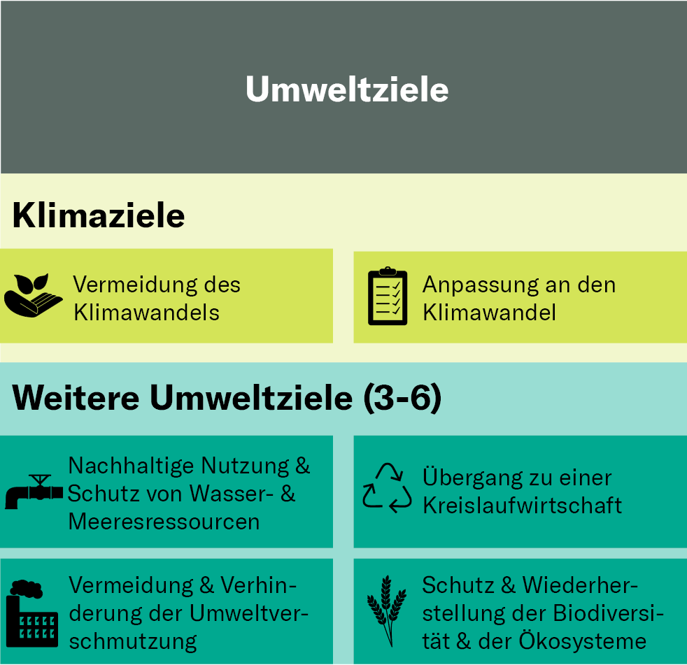 Die Taxonomie dient der Kennzeichnung „grüner” Aktivitäten, die in den neben­ste­henden sechs von der EU defi­nierten Klima- und Umwelt­zielen kate­gori­siert werden. Unternehmen müssen die Anteile ihrer Umsätze, Investitions- und Betriebsausgaben offenlegen, die aus Aktivitäten stammen, die von der EU-Taxonomie abgedeckt sind, sowie die Anteile, die taxonomie­konform sind.