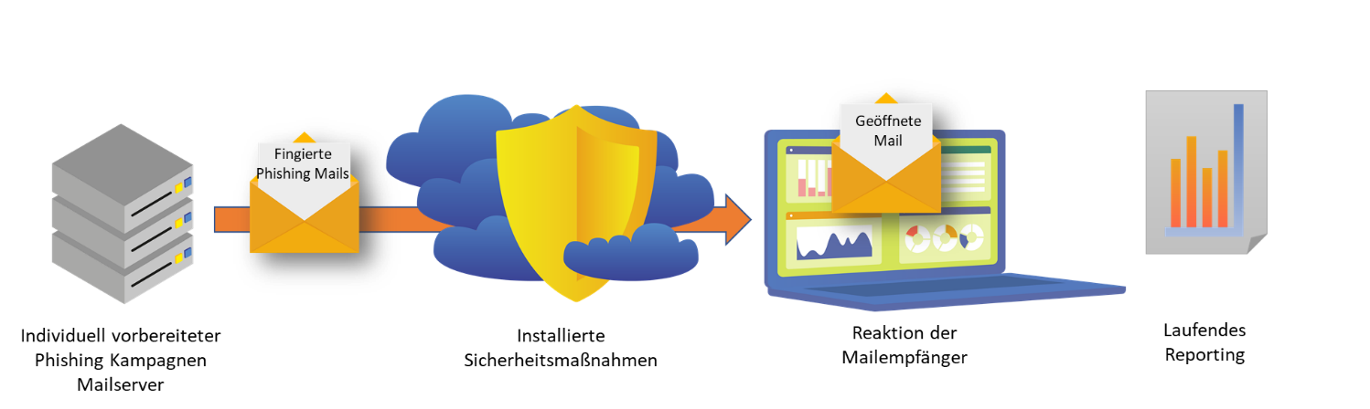 Aus allen Medien ist erkennbar, dass ein Angriff über das sogenannte Phishing als größte Cyber-Gefahr eingestuft wird. Phishing bedeutet, dass Mitarbeitende Mails mit kriminellem Hintergrund empfangen. Ziel dieser Mails ist es in der Regel, Informationen oder sogar Zugangsdaten abzugreifen bzw. sofort Schadcode in das Netzwerk des Empfängers zu übertragen. Ein erfolgreicher Angriff kann katastrophal sein. Da sich diese Angriffs-Mails sehr dynamisch weiterentwickeln, kann manchmal die Security-Technik nicht alles „abfangen”. Daher ist die Aufmerksamkeit der Mitarbeitenden als ein weiterer Schutzwall enorm wichtig. Hierzu dient eine sogenannte Awareness-Kampagne. Der Service besteht aus