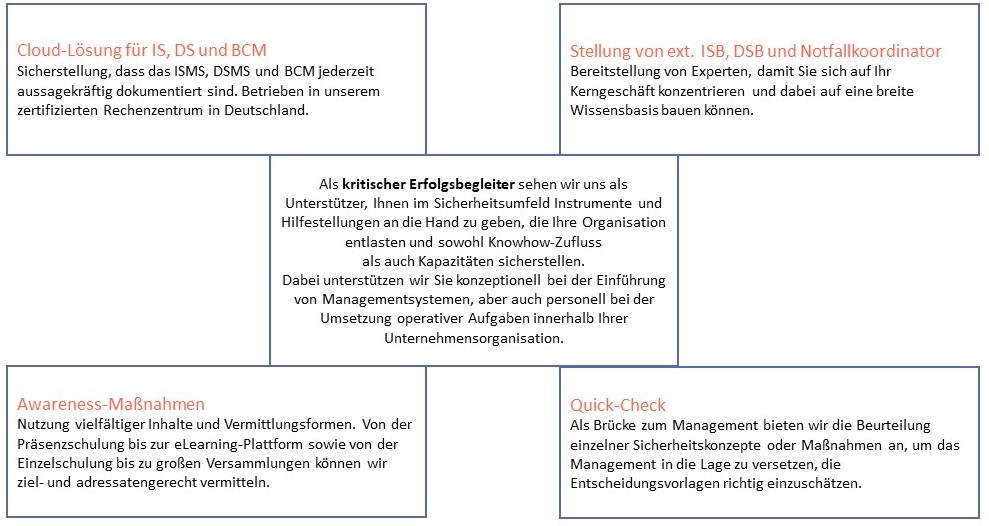 • Entlastung der internen Ressourcen durch Einsatz von Cloud-Technologien und externen Spezialisten in den Themen ISMS, DS und BCM