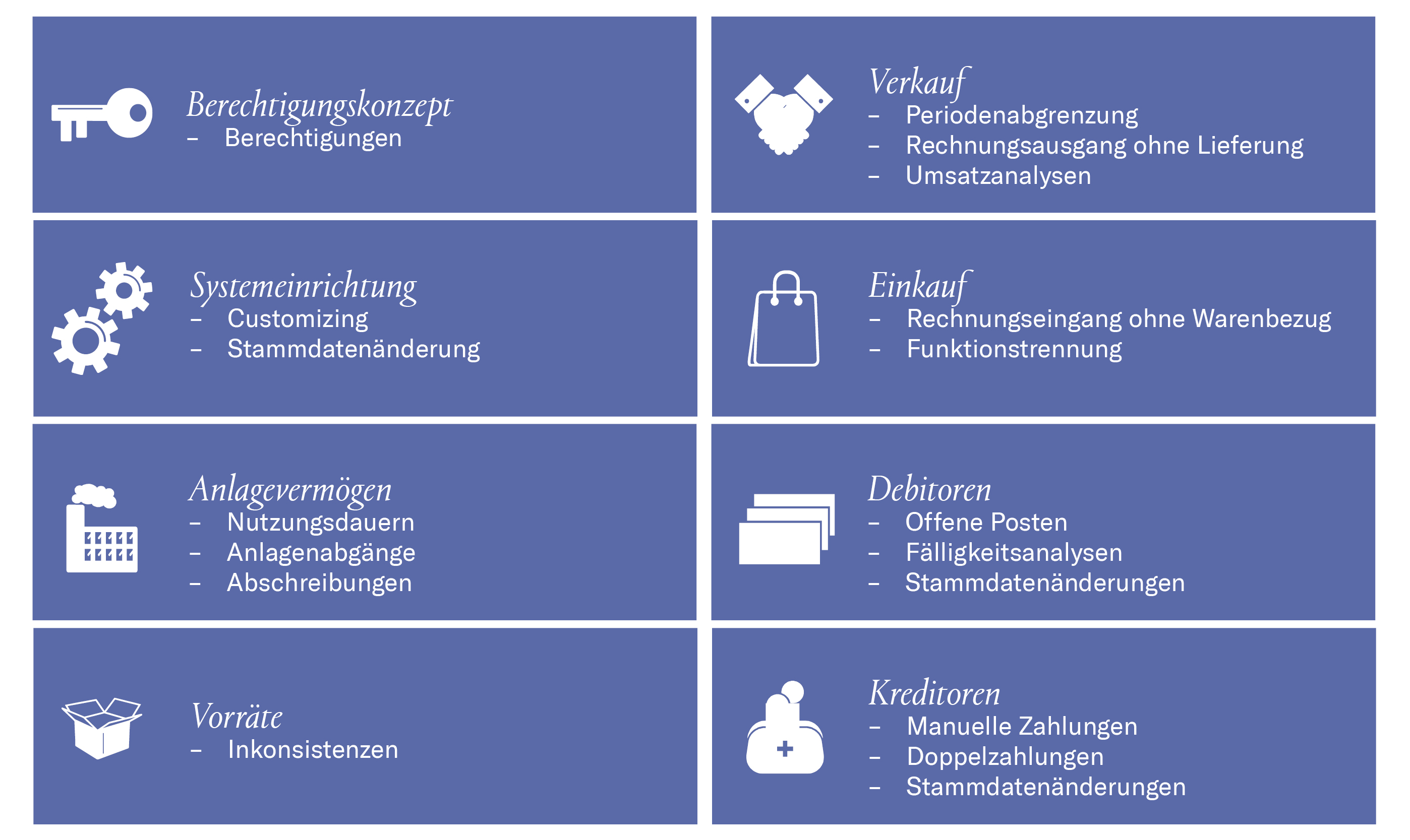 Neben klassischen Fragestellungen aus der Jahresabschlussprüfung, wie die Berechtigungsanalyse, die Aufdeckung von Fehlerquellen und möglicher doloser Handlungen zielen die Analysen auf die Einhaltung von Compliance Anforderungen sowie Schwachstellen in Geschäftsprozessen. Die gewonnen Erkenntnisse können als zentraler Bestandteil eines datenbasierten Risikomanagementsystems (RMS), der internen Revision oder eines angemessenen und wirksamen Internen Kontrollsystems (IKS) sowie zur Optimierung bestehender Geschäftsprozesse genutzt werden.