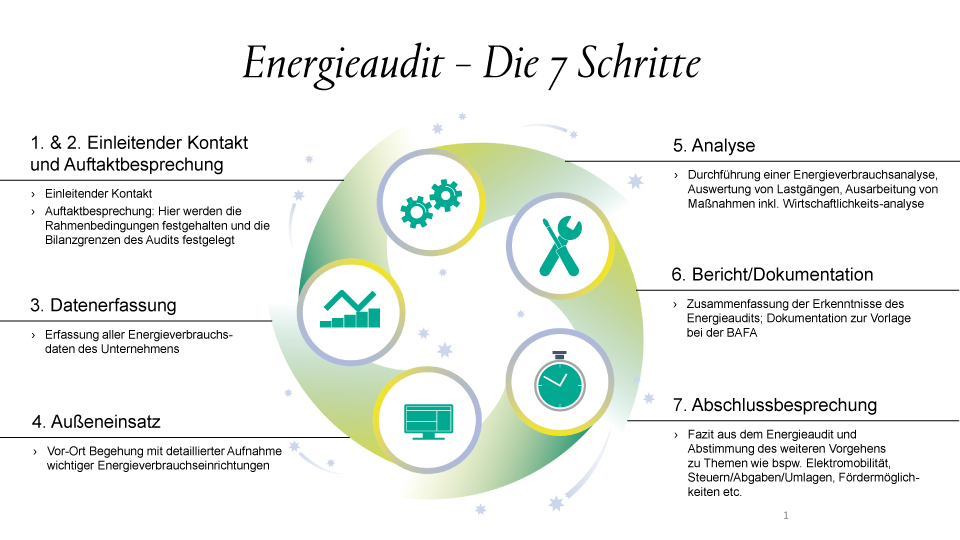 Die Potentiale sind bei vielen Unternehmen und Versorgern teils ungenutzt, teils aber auch unbekannt. Doch wie beginnt man, die eigene Potentiale zu nutzen? Hier ist ein Energieaudit behilflich. Für Nicht-KMUs sind diese alle vier Jahre verpflichtend. Doch auch für KMUs bieten Energieaudits den ersten Schritt in eine energieeffiziente Zukunft. Dem Gesetzgeber ist die Wichtigkeit der Engiereaudits bewusst – diese werden stark gefördert.