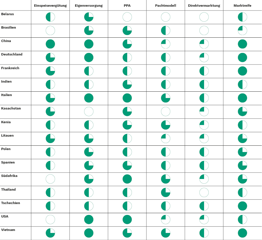 Die nachfolgende Tabelle gibt Ihnen einen Überblick über den aktuellen Stand der verschiedenen Vermarktungsmodelle und der gesamten Marktreife eines Landes.