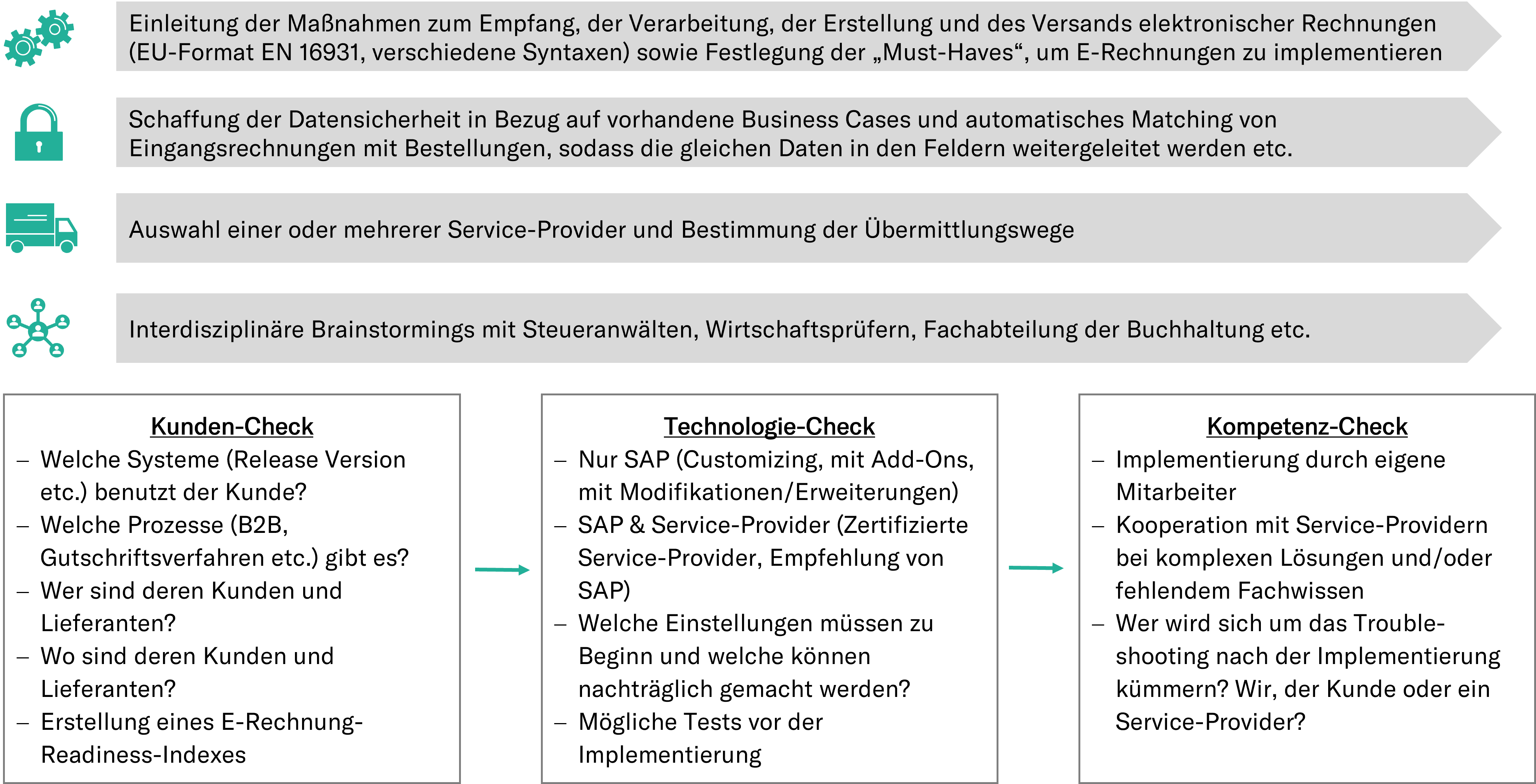 Um sich diesem Ziel zu nähern, gilt es, die bislang noch heterogen genutzten Systeme zu harmonisieren und die aktuellen Anforderungen im E-Rechnungsumfeld mit klaren Strategien auf den Weg zu bringen.