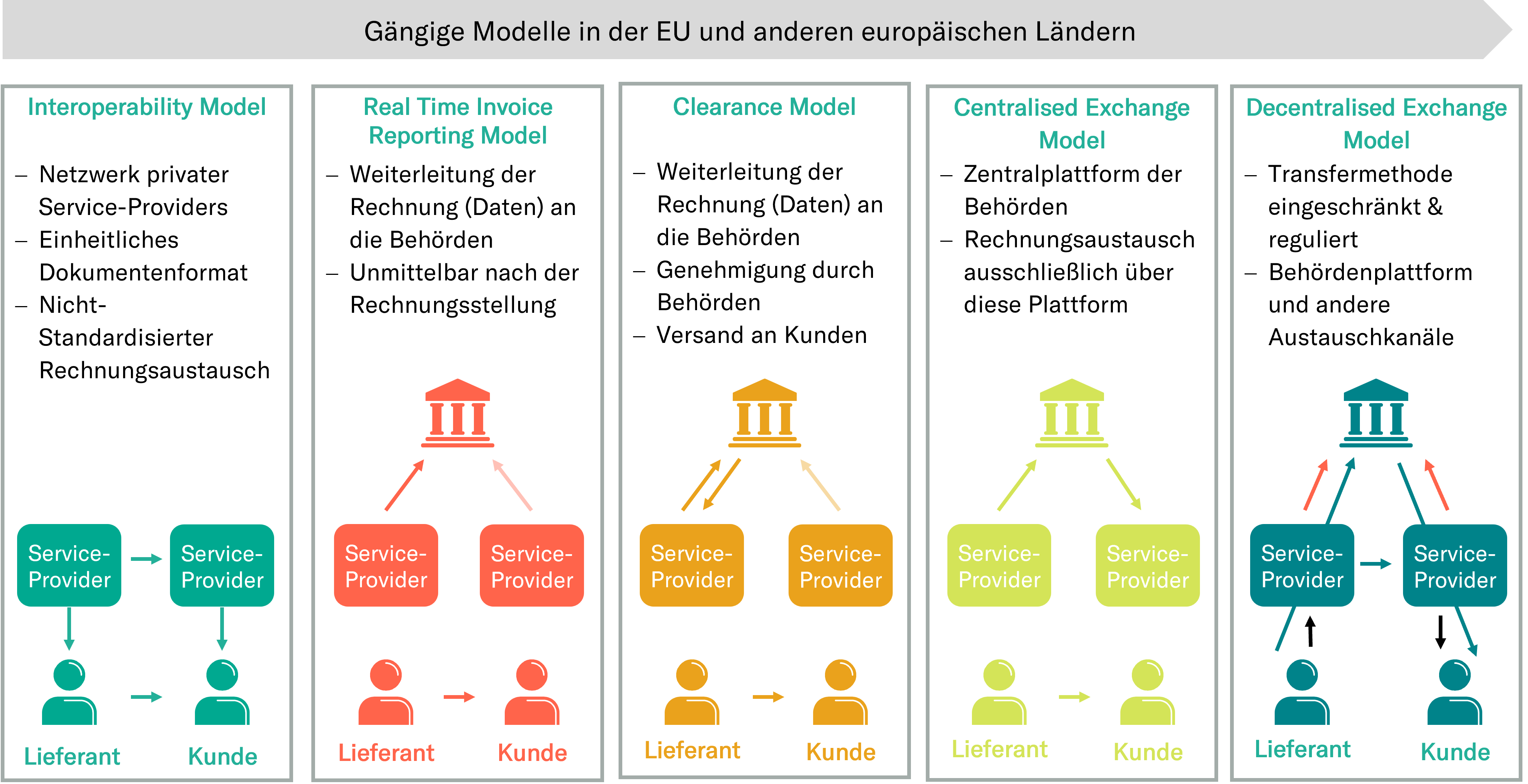 • In den Mitgliedstaaten der Europäischen Union werden derzeit unterschiedliche Systeme für die elektronische Übermittlung und Rechnungsstellung verwendet (Unterschiedliche technische Realisierung). Die verwendeten Implementierungsmodelle und Formate, sowie das System ist auf EU-Ebene heterogen. Frankreich und Spanien verwenden das „Decentralized Modell“ im Vergleich zu dem „Centralized Modell“ in Polen und Italien.