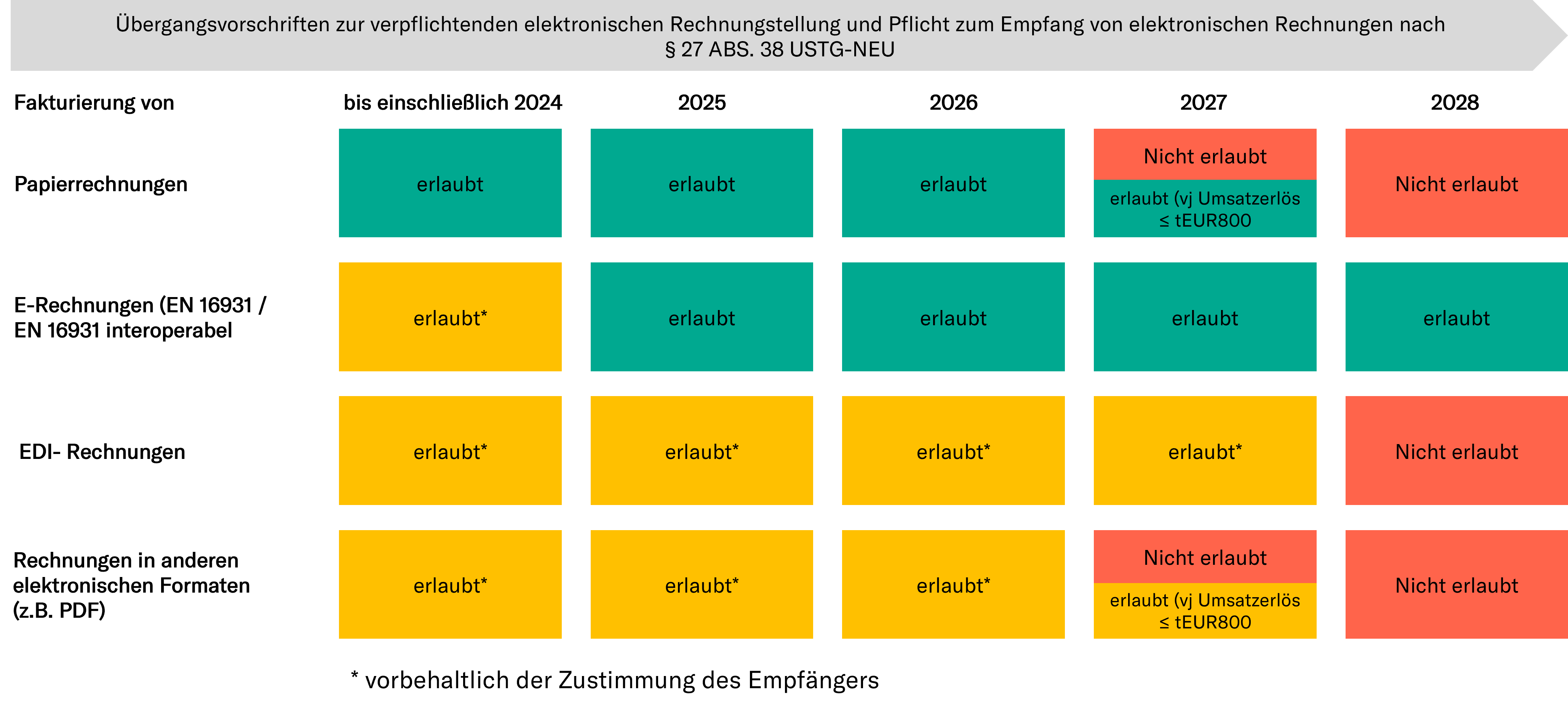 • Es ist eine Übergangsregelung zwischen dem 01.01.2025 und 31.12.2027 für die Erstellung und Erteilung der Rechnungen, also dem Rechnungsausgang, vorgesehen