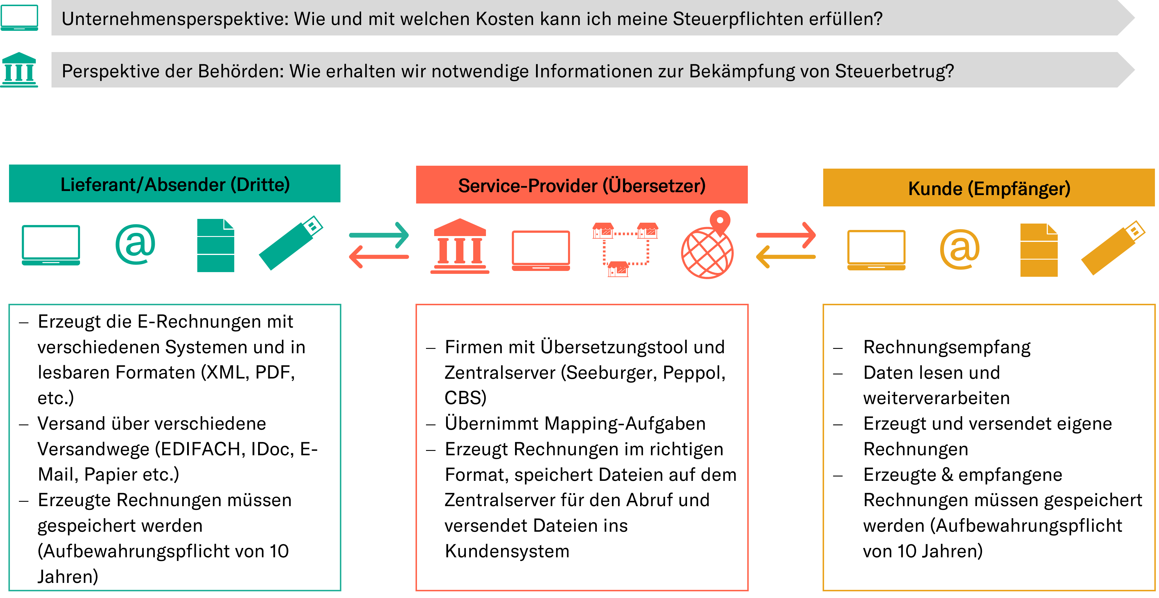 Aus der Perspektive der Behörden liegt dabei der Fokus auf der landesübergreifenden Kontrolle des Rechnungsstellungsprozesses. Hier stellt sich die Frage „Wie kommen die Behörden an die notwendigen Informationen zur Bekämpfung von Steuerbetrug?“ Möglichkeiten können hier u.a. sein: zentrales Clearing, behördeneigene Software, zertifizierte Service Provider, …“