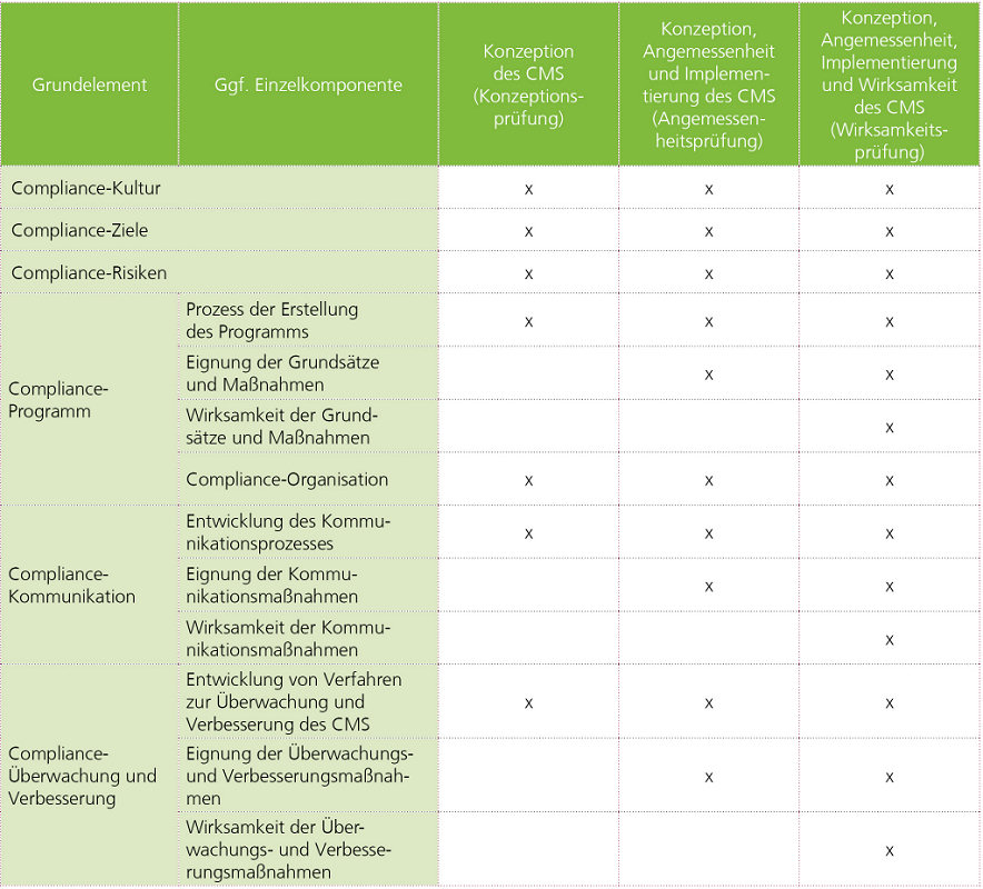 Für die Prüfung des CMS nach IDW PS 980 werden zu den Grundelementen des CMS teils mehrere Einzelkomponenten benannt. Je nachdem, welche Stufe für die Prüfung des CMS gewählt wurde (Konzeptionsprüfung, Angemessenheitsprüfung oder Wirksamkeitsprüfung), wird eine entsprechende Auswahl der Komponenten in die Prüfung einbezogen. Das Ergebnis der Prüfung wird in einem Prüfungsbericht dokumentiert.