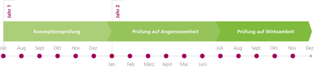 Es hat sich als äußerst zielführend erwiesen, wenn der Wirtschaftsprüfer bereits bei der Konzeptionierung eingebunden wird. Als erster Meilenstein auf dem Weg zu einem voll wirksamen CMS kann die Konzeption geprüft und mit einer entsprechenden Bescheinigung nach PS 980 versehen werden. Die zeitliche Abfolge kann sich dann beispielsweise wie folgt darstellen: