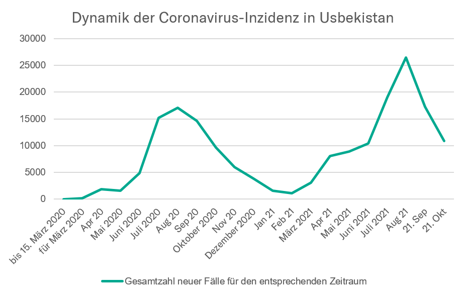 Die Regierung Usbekistans ergreift weiterhin geeignete Maßnahmen zur Bekämpfung des Coronavirus. Die Bevölkerung wird kontinuierlich zur Impfung aufgefordert. Strenge Quarantänemaßnahmen sind nicht geplant. Trotz der Rekordzahl von Infektionen in Usbekistan in diesem Sommer, wie die Statistik zeigt (siehe Grafik 1 unten), hat sich die Situation derzeit nach der Darstellung der usbekischen Regierung entspannt.