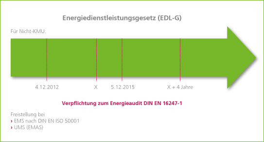 Die Änderungen des Energiedienstleistungsgesetzes (EDL-G), die Unternehmen zu einem Energieaudit verpflichten, sind am 22. April 2015 in Kraft getreten. Diese Pflicht ist erfüllt, wenn in der Zeit vom 4. Dezember 2012 und dem 5. Dezember 2015 ein Energieaudit durchgeführt worden ist. Gerechnet vom Zeitpunkt des ersten Audits ist in der Folgezeit alle vier Jahre wieder ein Energieaudit durchzuführen.