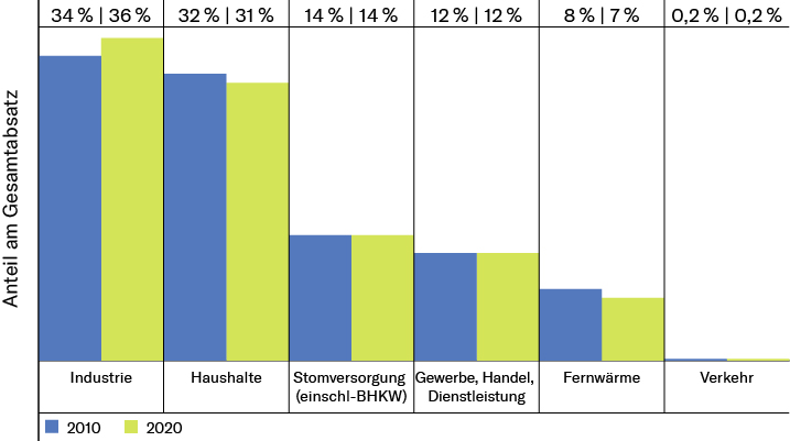 Zunächst einige Zahlen: Mit rund 36 Prozent ist die deutsche Industrie der Hauptabnehmer von Erdgas, das als Brenn- und Rohstoff in verschiedenen Produktionsprozessen wie beispielsweise der Herstellung von Glas, Ziegeln, Stahl oder Chemikalien verwendet wird. Nach der Industrie sind die Haushalte in Deutschland mit einem Anteil von ca. 31 Prozent der zweitgrößte Verbraucher von Erdgas. Erdgas ist insoweit mit weitem Abstand der beliebteste und wichtigste Energieträger im Wärmemarkt und sorgt in nahezu jeder zweiten Wohnung Deutschlands für Wärme. Etwa 12 Prozent des Erdgases in Deutschland werden von der Gruppe Gewerbe, Handel und Dienstleistungen verbraucht.