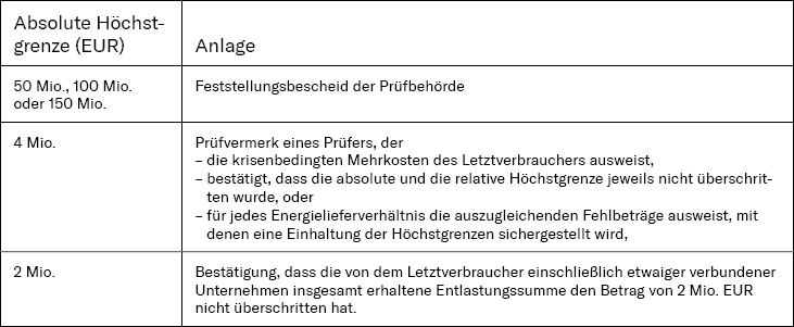 In der finalen Selbsterklärung muss das erklärende Unternehmen seine tatsächlich anzuwendende absolute Höchstgrenze angeben – d.h. die absolute Höchstgrenze der zu gewährenden Entlastungssumme vor Abzug von Steuern und sonstigen Abgaben.