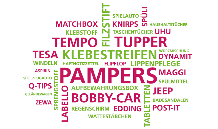Unsere Word-Cloud stellt eine Auswahl an Marken-Deonymen und den dazugehörigen Gattungsnamen dar. Wenn Sie Lust haben: Finde Sie die jeweiligen Paare, die wie Pampers und Windel zusammengehören.
