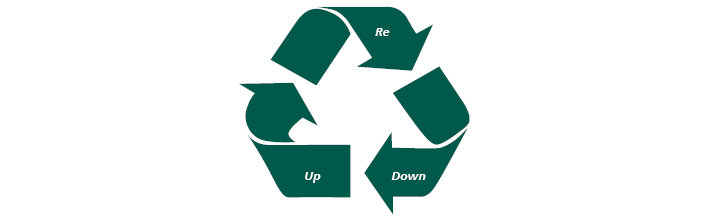 Übrigens: In vielen Recyclingkreisläufen sinkt mit jeder Verarbeitungsstufe und jedem Wieder­verwertungs­zyklus das Wertniveau des Recyclats (z.B. Papierfasern werden kürzer, Kunststoffmoleküle brüchig). Der Recyclingprozess mit Qualitätsverlust wird als „Downcycling” bezeichnet.
