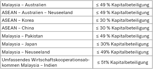 • Ausländische Kapitalbeteiligungen im Rahmen von Freihandelsabkommen sind wie folgt geregelt: