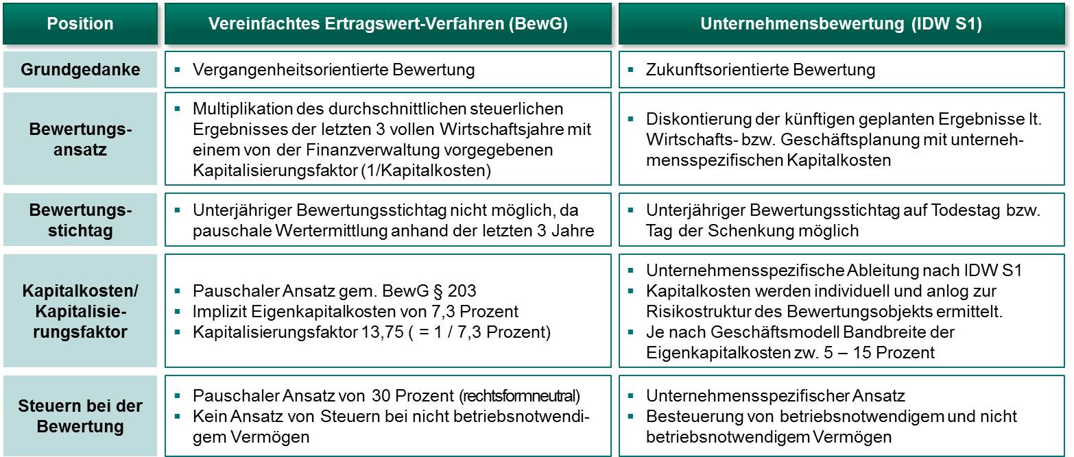 Die Steuerverwaltung gewährt dem Steuerpflichtigen die Möglichkeit des Methodenwahlrechts zwischen dem vereinfachten Ertragswertverfahren (vEWV) und einer Unternehmensbewertung nach dem Standard „Grundsätze zur Durchführung von Unternehmensbewertungen” des Instituts der Wirtschaftsprüfer in Deutschland e.V. (kurz IDW S1).