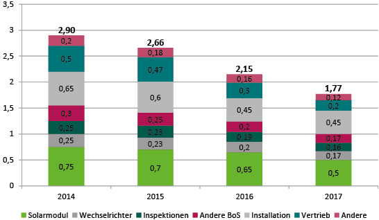 In der jüngeren Vergangenheit konnten Kosten für Solarmodule bereits stark reduziert werden, sodass Werte von unter 0,5 $/Watt bereits heute erreicht werden. Bis 2016 haben Branchengrößen wie SunEdison hier einen Wert von 0,4 $/Watt als Ziel ausgegeben, was bei branchenüblichen Einsparungen von 1-2 Cents pro Quartal als recht konservativ angesehen werden kann. Sinkende Transportkosten und eine weitere Liberalisierung des weltweiten Handels spielen außerdem eine Rolle. Preise für Wechselrichter fallen momentan um 10 bis 15 Prozent pro Jahr. Es wird erwartet, dass sich dieser Trend auch in Zukunft fortsetzt, da insbesondere bei der Produktion in Bereich Beschaffung und Effizienz noch Einsparpotenziale zu finden sind. Steigender Wettbewerb führt zudem zu tendenziell fallenden Preisen. Inspektionskosten und andere Kosten der Systemperipherie werden voraussichtlich jeweils um circa 8 Cent bis 2017 sinken. Grund hierfür ist neben Effizienzsteigerungen auch der Einsatz fortschrittlicher Materialien.