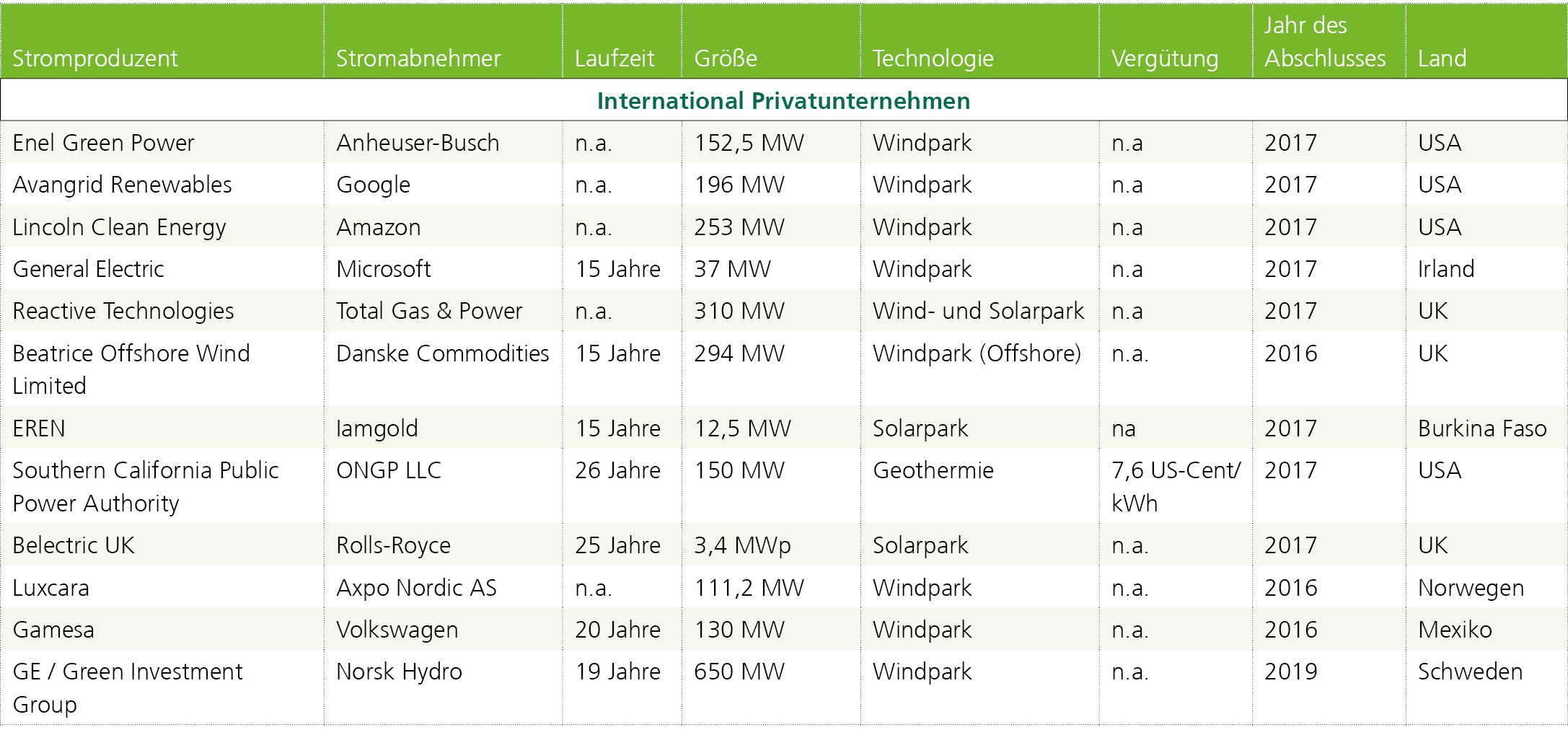 Die folgende Tabelle zeigt Corporate PPA im Ausland und ein paar wenige in Deutschland. Auch wurde ein Fokus bei der Recherche auf Großprojekte gelegt. Die unzähligen kleineren „Contracting”-Projekte sind wohl kaum erfassbar.