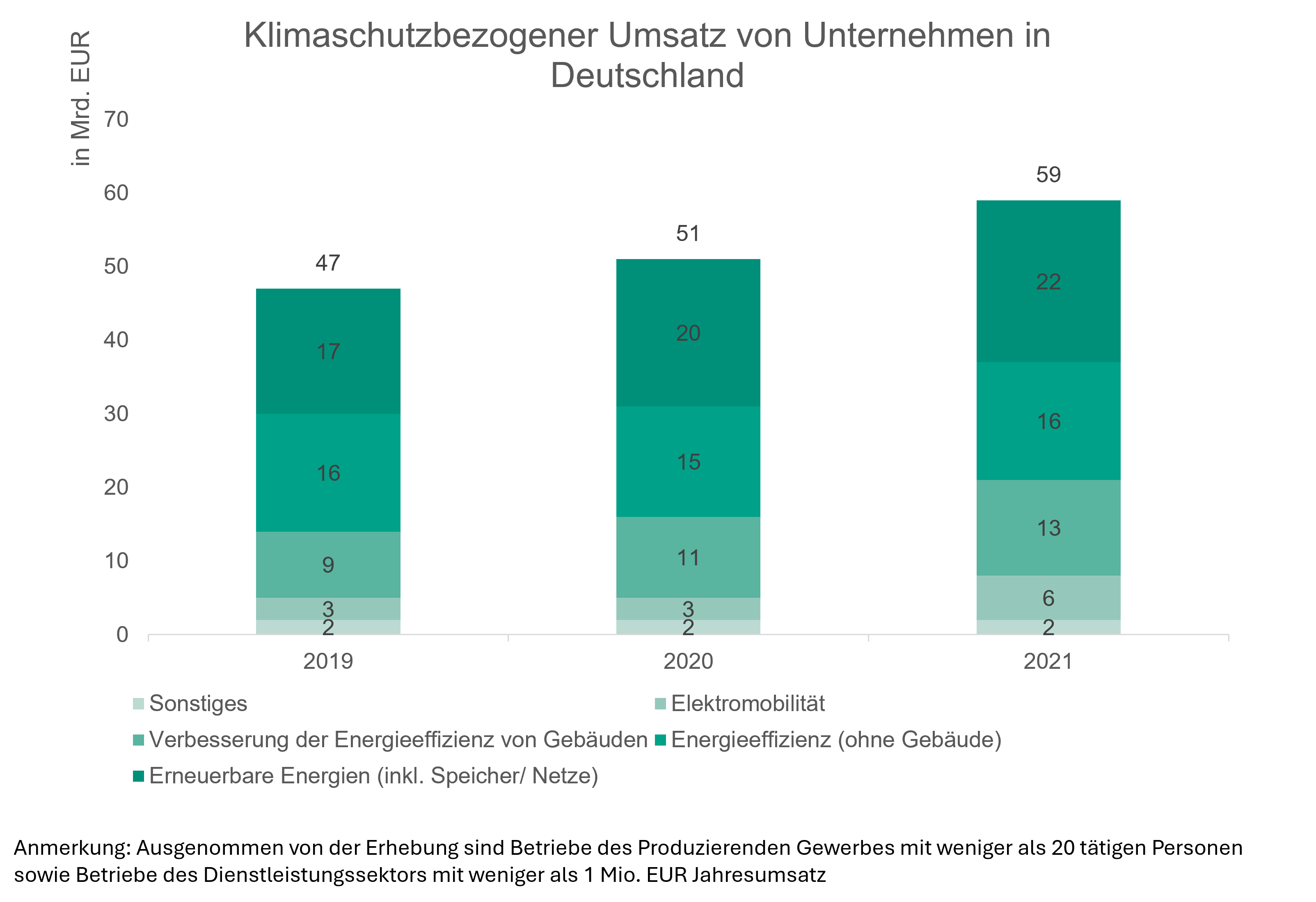 Eine Studie der KfW zeigt, dass 22% aller befragten Unternehmen planen, innerhalb der nächsten drei Jahren Produkte oder Dienstleistungen mit Klimaschutzbezug anzubieten. Allen voran stellt die Baubranche, die aktuell den höchsten Anteil an Unternehmen mit Klimaschutzgütern in ihren Produktportfolios verzeichnet, ins​​gesamt 52%8 . Im Rahmen des klimaschutzbezogenen Umsatzes deutscher Unternehmen nehmen die erneuerbaren Energien, inklusive Speicher und Netze dabei die Spitzenrolle ein.