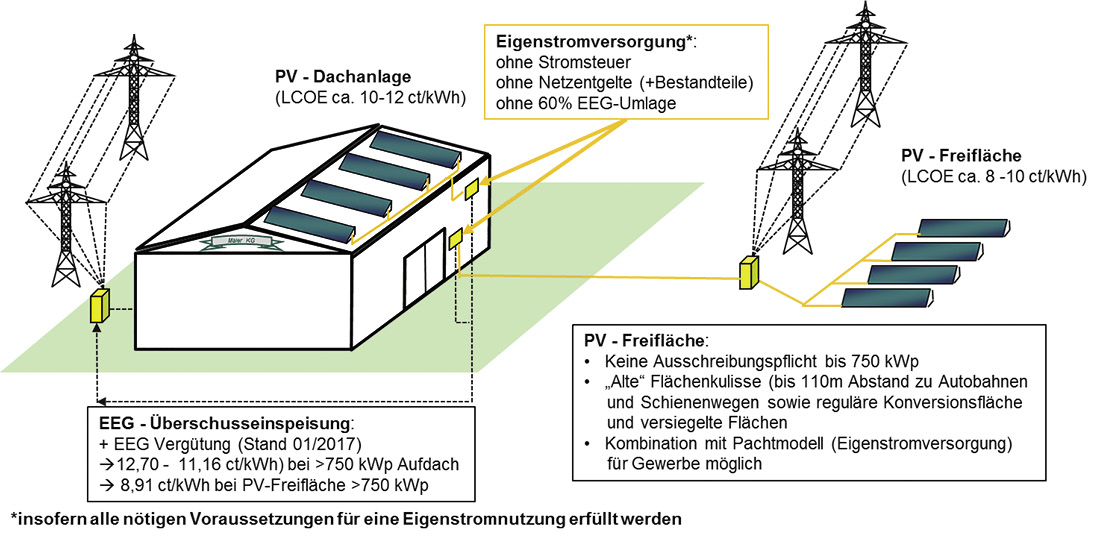 Insbesondere der letzte Punkt, die Pflicht zur vollständigen Einspeisung im Rahmen des Ausschreibungsmodells, hat wirtschaftlich attraktive Versorgungskonzepte bei Freiflächenanlagen verhindert – die sogenannten „Eigenverbrauchsmodelle”. Es kann nun ein Teil des erzeugten Stroms für den Eigenverbrauch genutzt werden und der überschüssige Strom wird gegen eine feste Vergütung in das öffentliche Netz eingespeist. Die Strommenge, die direkt vor Ort verbraucht wird, substituiert den Strombezug aus dem Netz und senkt so die Stromkosten. Zusätzlich fällt auf den eigenerzeugten und eigenverbrauchten Strom in 2017 nur die verringerte EEG-Umlage in Höhe von 40 Prozent an (§ 61b EEG 2017).