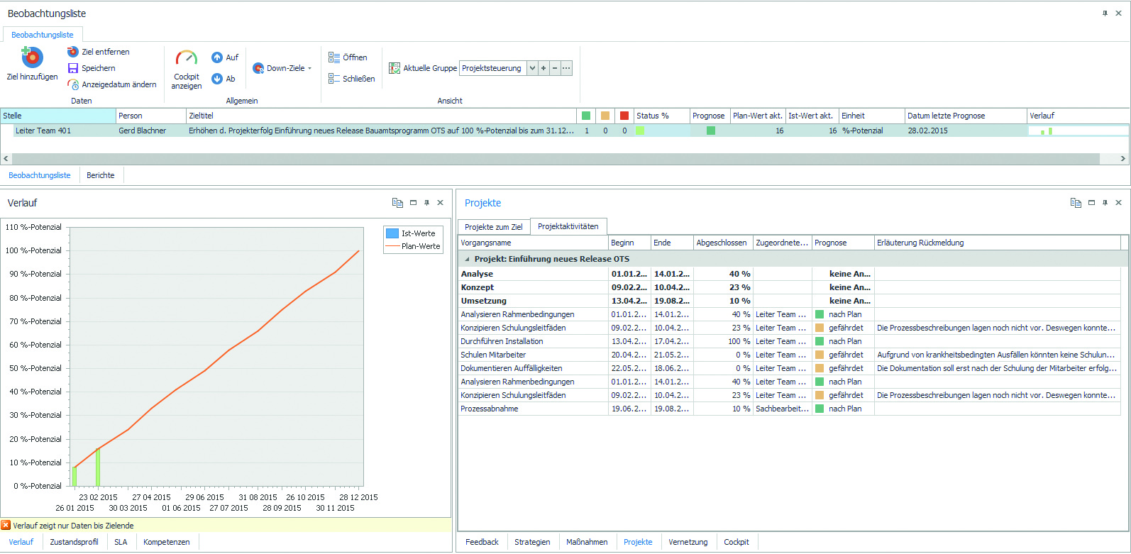 • Möglichkeit eines monatlichen Feedbacks zur Ausführung vorgegebener Projektsteuerungsaufgaben für die zentralen und dezentralen Projektmanager