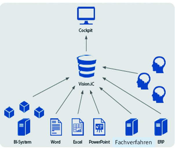 Für eine strategische und operative Steuerung kommen zwangsläufig verschiedene Tools und Methoden zur Anwendung, die sich mit Visionen, Zielen, Strategien, Maßnahmen, Aufgaben und Prozessen sowie Risiken, Stärken und Schwächen beschäftigen, d.h. Strategie-, Personal- und Organisationsentwicklungsansätze enthalten. Deswegen muss ein Steuerungskonzept entwickelt und softwaretechnisch umgesetzt werden, das alle Themen in einem integrierten IT-gestützten Führungs- und Steuerungssystem vereint. Rödl & Partner setzt in seinen Projekten auf das integrierte Führungssystem Vision.iC. Die Software liefert Führungsinformationen aus erster Hand. Mit der übersichtlichen Darstellung im Vision.iC-Cockpit ist es auch bei vielen vernetzten Zielen möglich, den Überblick zu behalten und die richtigen Entscheidungen zu treffen.
