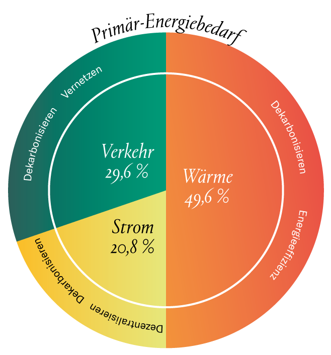 Abbildung 2 zeigt im inneren Kreis den Primärenergiebedarf (inklusive Industrie) für die Sektoren Wärme (inklusive Gebäude), Strom und Verkehr. Im äußeren Ring werden übergeordnete Ziele dargestellt, die Kommunen im jeweiligen Sektor verfolgen können.