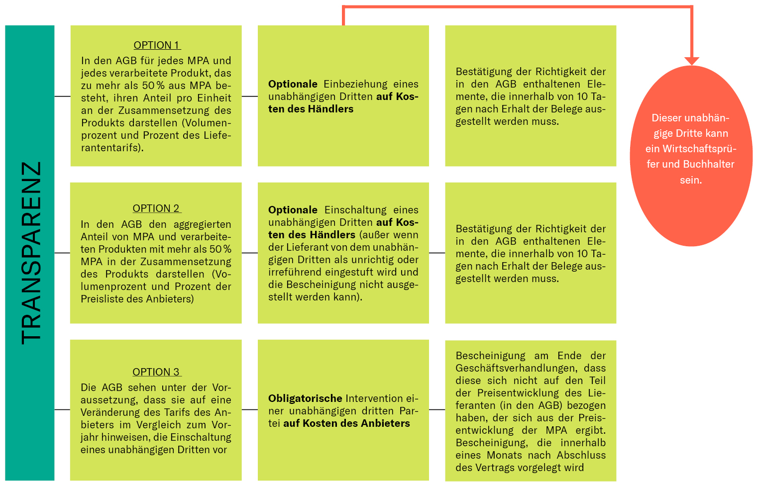 • Eine Klausel, die eine automatische Preisanpassung vorsieht, wenn sich die Kosten für landwirtschaftliche Roh­stoffe nach oben oder unten verändern. Das Nichtvorsehen einer solchen Klausel wird mit einer Geldstrafe von bis zu 375.000 Euro für eine juristische Person geahndet.