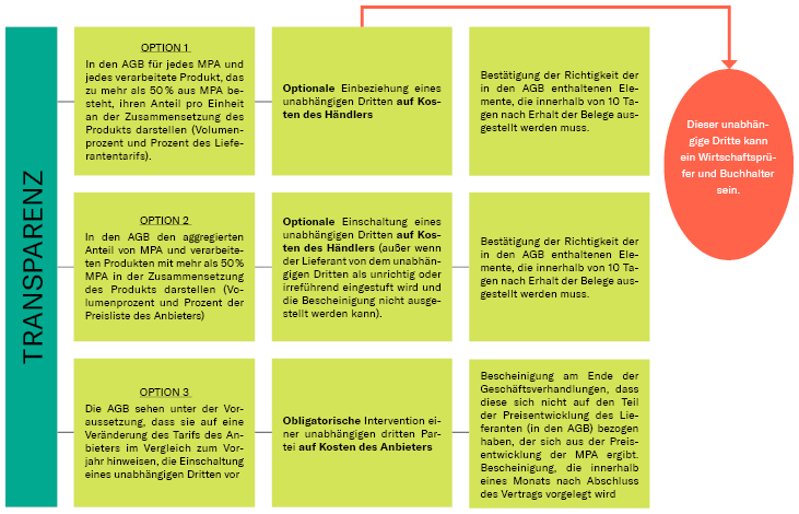 Der Hauptzweck dieser vertraglichen Mechanismen besteht darin, den Teil des Preises, der den Preisen für primäre Agrarprodukten entspricht, in der gesamten Produktions-, Verarbeitungs- und Vertriebskette von Lebensmitteln zu sichern. Zu diesem Zweck sind eine Transparenzpflicht für den Preis der Rohstoffe, der dann nicht mehr verhandelbar ist, sowie mehrere Preisanpassungsmechanismen (automatische Preisänderungsklausel, Neuverhandlungsklausel usw.) vorgesehen.