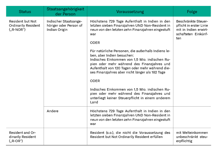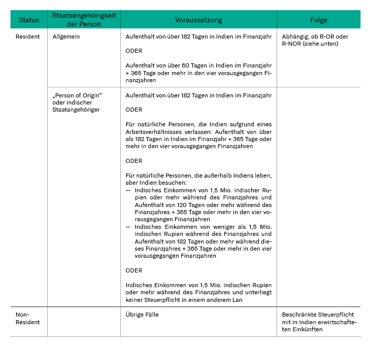 Ähnlich wie im deutschen Steuerrecht richtet sich die Steuerpflicht einer natürlichen Person in Indien nach der steuerlichen Ansässigkeit. Das ergibt sich aus Sec. 6 ff des Income Tax Act, 1961 („ITA”). Dabei ist nur die physische Präsenz im Inland entscheidend und nicht das Vorhalten einer Wohnstätte. Auf den Zweck des Aufenthalts oder die Staatsagehörigkeit kommt es nicht an. Es wird grundsätzlich zwischen „Resident and Ordinarily Resident”, „Resident but Not Ordinarily Resident” und „Non-Resident” unterschieden.
