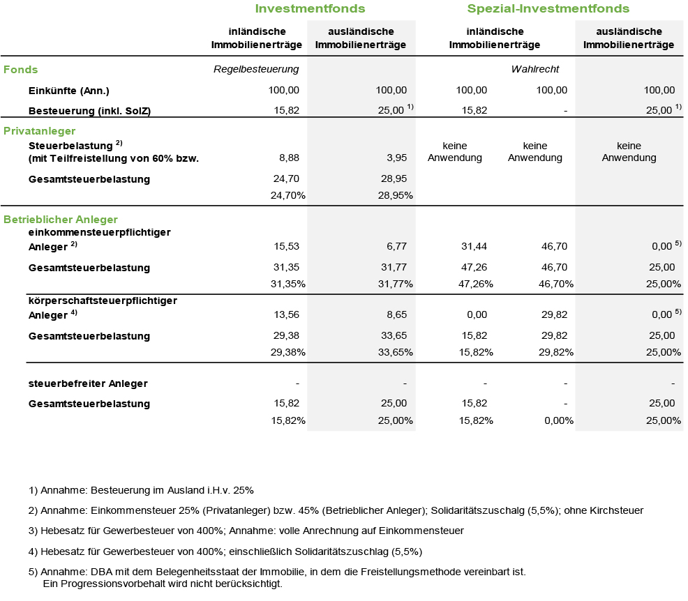 Die neue Besteuerung von inländischen Investmentfonds bzw. Spezial-Investmentfonds führt im Vergleich zum alten Recht zu anderen Steuerbelastungen. Nachstehend wird am Beispiel von direkten Immobilien­investments dargelegt, mit welchen zukünftigen Gesamtsteuerbelastungen Fondsanleger rechnen müssen: