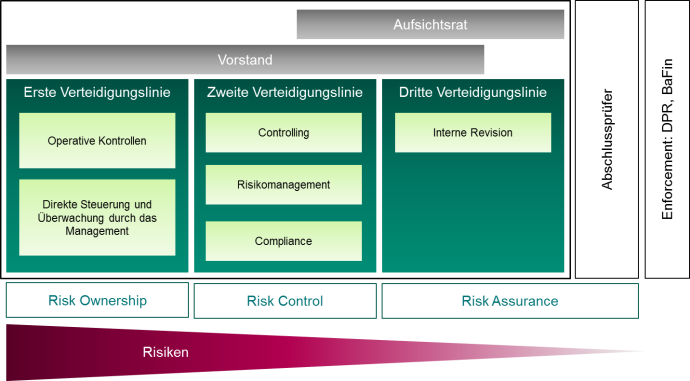 Für ein solches ganzheitliches Governance, Risk und Compliance Management System (GRC-System) zur Steuerung der Unternehmensrisiken kann das Three Lines of Defense-Modell, veröffentlicht durch das Institute of Internal Auditors (IIA), als Ordnungsrahmen dienen.