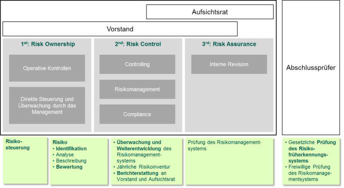 Kern des Modells ist die Gliederung von Unternehmensfunktionen, die der Steuerung der Risiken dienen, in 3 von Aufsichtsrat und Vorstand zu überwachende Bereiche – sog. „Verteidigungslinien”.