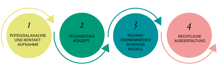 Damit aus gemeldeten Potenzialen belastbare Wärmelösungen werden, bedarf es eines strukturierten Vorgehens. In der Praxis hat sich ein vierstufiger Prozess bewährt – von der ersten Potenzialanalyse bis zur rechtlichen Ausgestaltung. Jede Phase baut auf der vorhergehenden auf und erfordert ein interdisziplinäres Zusammenspiel von Technik, Wirtschaft und Recht.
