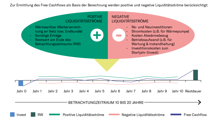Dem gegenüber stehen negative Liquiditätsströme, also Auszahlungen, die während der Projektlaufzeit anfallen. Dazu zählen die Investitionskosten im Startjahr, laufende Stromkosten (z. B. für Wärmepumpen), Kosten für den Bezug von Abwärme, regelmäßige Betriebsaufwendungen wie Wartung und Instandhaltung sowie mögliche Re- oder Neuinvestitionen in den Folgejahren.