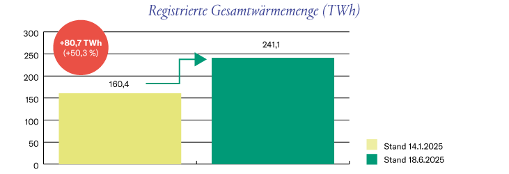 Die Relevanz industrieller Abwärme zeigt sich dabei nicht zuletzt in der Dynamik der gemeldeten Daten: Seit dem 14.1.2025 ist die auf der Plattform erfasste Gesamtwärmemenge von 160,4 TWh auf 241,1 TWh angestiegen (Stand: 18.6.2025). Das ist ein Zuwachs von über 80 TWh innerhalb von fünf Monaten. Der deutliche Anstieg zeigt, dass sich zunehmend mehr Unternehmen aktiv mit ihren Abwärmepotenzialen auseinandersetzen und diese sichtbar machen.