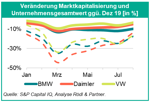 EBITDA-Multiples sind den Bruttoverfahren zuzuordnen und werden aus dem Unternehmensgesamtwert („Entity Value”), bestehend aus der Marktkapitalisierung und der Finanzverschuldung abgeleitet. Wie in der folgenden Grafik dargestellt sind die Marktkapitalisierungen (gestrichelte Linien) im Vergleich zu den Unternehmensgesamtwerten (nicht gestrichelt) im ersten Halbjahr 2020 relativ betrachtet überproportional gefallen.