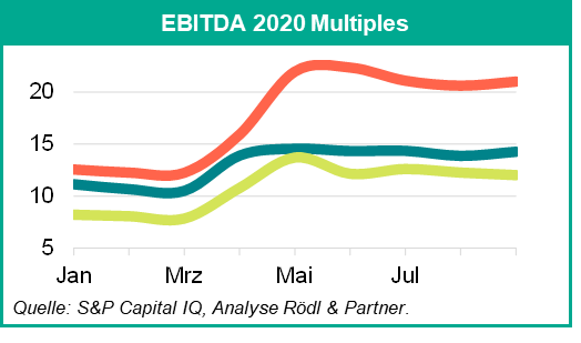 Der Grund für diese widersprüchliche Entwicklung liegt in der überproportionalen Reduktion von EBITDA-Prognosen für das Jahr 2020 im Vergleich zu dem am Kapitalmarkt beobachteten Rückgang der Unternehmensgesamtwerte. Die steigenden Multiples sind somit kein Anzeichen für eine Erhöhung der Unternehmenswerte, sondern resultieren vielmehr aus einem mathematischen Effekt bei der Ermittlung der Multiples (das EBITDA 2020 im Nenner sinkt stärker als der Unternehmensgesamtwert im Zähler) sowie einer durch die Krise nicht repräsentativen Ertragslage im Jahr 2020.