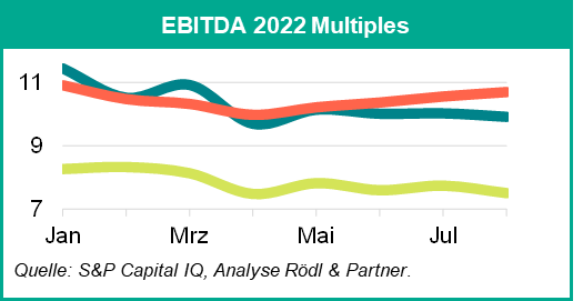 Trotz des Rückgangs der Aktienkurse sind die impliziten EBITDA-Multiples im selben Zeitraum jedoch gestiegen (vgl. folgende Grafik).