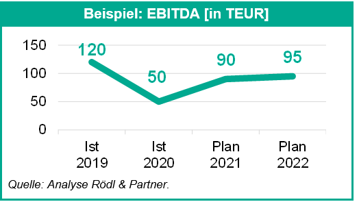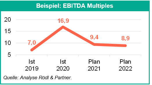 Auf Basis des Unternehmensgesamtwertes (Beispiel: TEUR 844) sowie der geplanten EBITDA-Entwicklung wurde somit implizit ein EBITDA-Multiple von 9,4 (2021) bzw. 8,9 (2022) bezahlt (siehe Grafik).