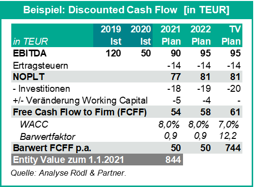 Neben einer Multiple-Bewertung empfiehlt es sich zudem eine kapitalwertorientierte Bewertung, bspw. auf Basis des Discounted Cash Flow Verfahrens, durchzuführen. Bei diesem zukunftsorientierten Bewertungsverfahren resultiert der Unternehmenswert vor allem aus einer nachhaltigen, bereinigten Ertragskraft und wird daher weniger durch temporäre Kriseneffekte verzerrt.