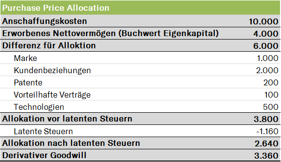 Im Rahmen einer PPA sind zum Erwerbszeitpunkt die Anschaffungskosten des Unternehmenserwerbs (Kaufpreis) auf die identifizierbaren und mit dem beizulegenden Zeitwert neubewerteten Vermögenswerte, Schulden sowie Eventualschulden des erworbenen Unternehmens zu verteilen. Die als Ergebnis einer PPA verbleibende positive Rest-größe zwischen den Anschaffungskosten und dem unter Berücksichtigung latenter Steuern ermittelten anteiligen Fair Value des Nettovermögens (neubewertetes Eigenkapital), ergibt den unter den immateriellen Vermögenswerten auszuweisenden Goodwill. Das nachstehende Beispiel veranschaulicht die Ableitung des Goodwills im Rahmen einer PPA.