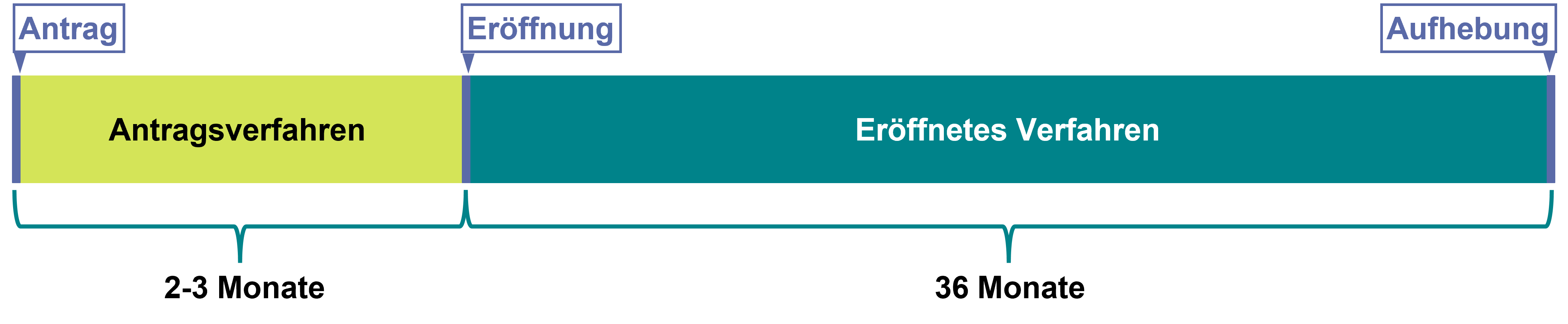 Der Zugang zur Eigenverwaltung erfordert einen entsprechenden Antrag, dem eine Eigenverwaltungsplanung beizufügen ist. Ist die Eigenverwaltungsplanung vollständig und schlüssig, ordnet das Gericht die vorläufige Eigenverwaltung an. Nach erfolgreicher Anordnung der Eigenverwaltung folgt als zweite Phase das eröffnete Verfahren, bevor nach der Aufhebung des Verfahrens die Fortführungsphase eintritt (siehe Abbildung).