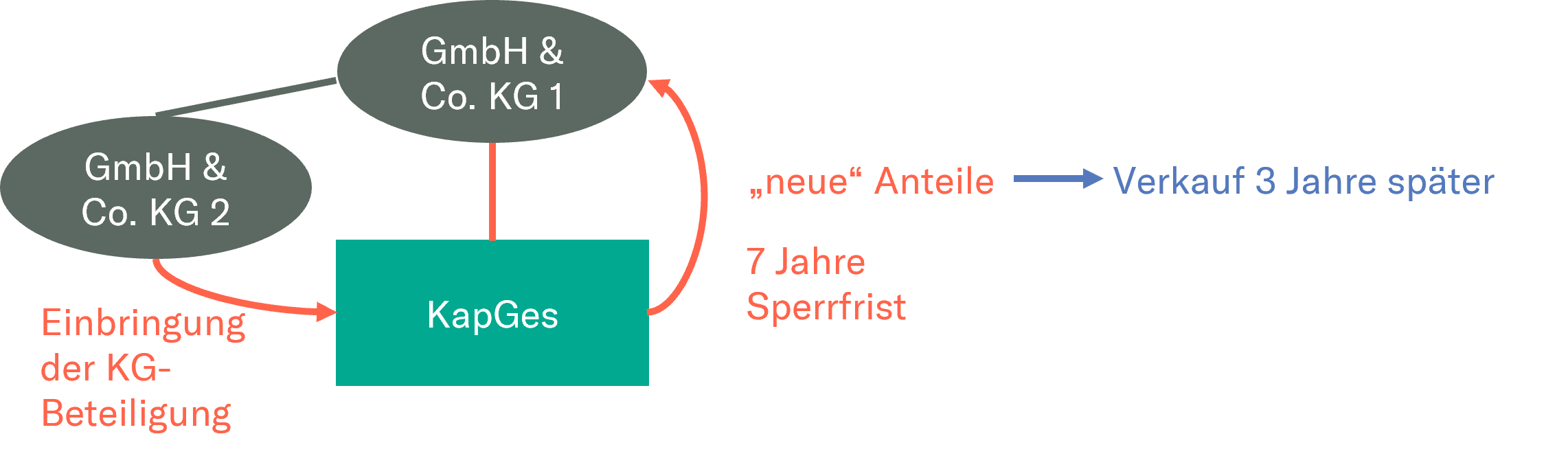 Die Einbringende, die GmbH & Co. KG 1, erhält für die steuerneutrale Einbringung der 100%-Kommanditbeteiligung an der GmbH & Co. KG 2 in die Kapitalgesellschaft (KapGes) neue Anteile an dieser. Drei Jahre später verkauft die GmbH & Co. KG 1 alle Anteile an der KapGes.