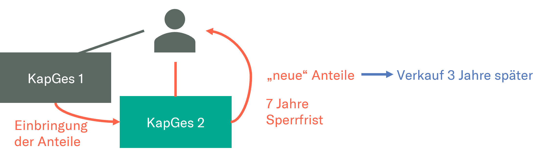 Der Einbringende, die natürliche Person X, erhält für die steuerneutrale Einbringung der Anteile an der Kapitalgesellschaft 1 (KapGes 1) in die Kapitalgesellschaft 2 (KapGes 2) neue Anteile an der KapGes 2. Drei Jahre später verkauft die KapGes 2 alle Anteile an der KapGes 1.
