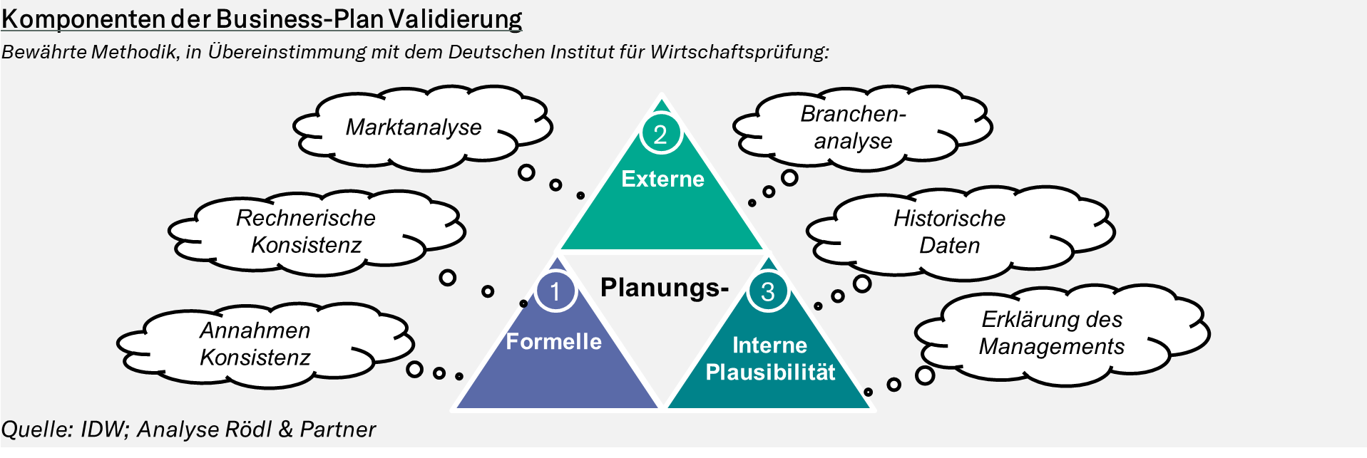 Bei der Durchführung einer Businessplan-Plausibilisierung orientiert sich Rödl & Partner in der Rolle eines Gutachters an den Vorgaben des IDW PH 2/2017. Im Rahmen dieser Plausibilisierung werden umfassende Analysen durchgeführt, um die Angemessenheit und Nachvollziehbarkeit der vorgelegten Planungsrechnungen zu gewährleisten.