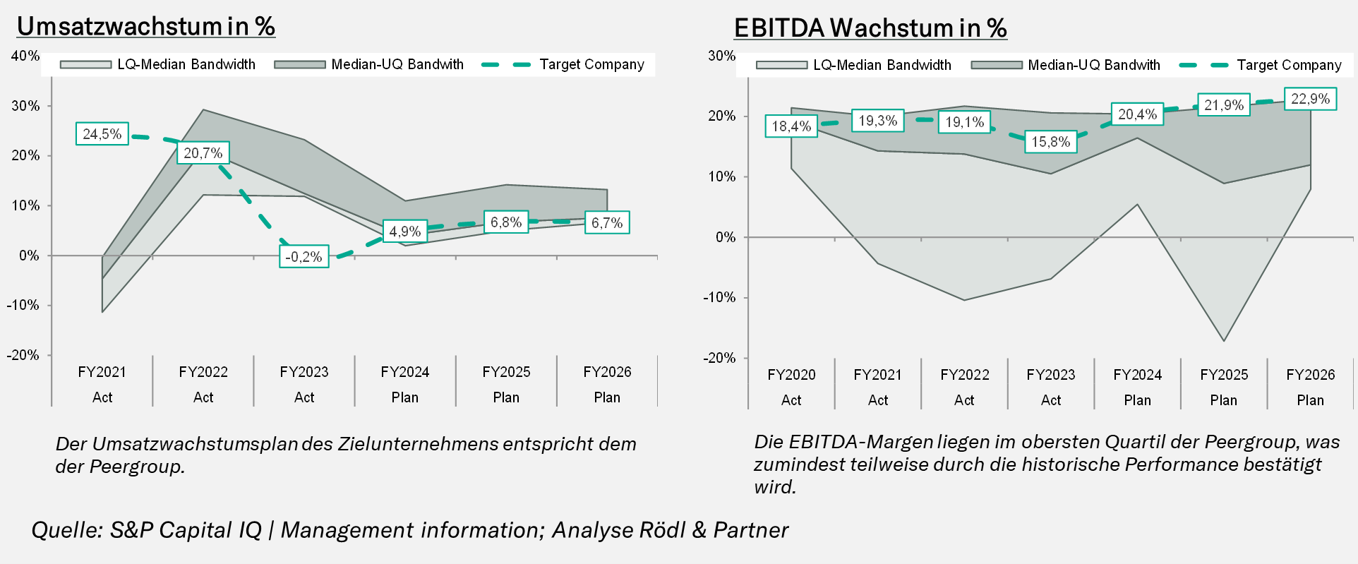 Die KPI-basierten Vergleiche mit der Peergroup ermöglichen eine Aufschlüsselung spezifischer Posten und liefern gleichzeitig Hintergrunddaten zur Ermittlung möglicher Bandbreiten. Rödl & Partner führt dabei ein Umsatz- und Rentabilitäts-Benchmarking durch, um das geplante Umsatz- und Ertragswachstum im Prognosezeitraum zu vergleichen (siehe Abbildung 2).​Zudem wird eine Plausibilisierung des Ertragswertes mittels Multiple-Bewertungen durchgeführt. Diese Methode beinhaltet den Vergleich von Kennzahlen wie dem Kurs-Gewinn-Verhältnis (KGV), Umsatz- oder EBITDA- und EBIT-Multiplikatoren, um die Marktbewertung des zu bewertenden Unternehmens zu überprüfen. Durch den Abgleich mit vergleichbaren Unternehmen und Branchenbenchmarks wird die Angemessenheit der Bewertungsannahmen und -prognosen im Businessplan sichergestellt.​
