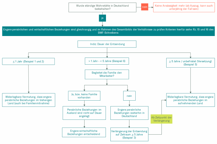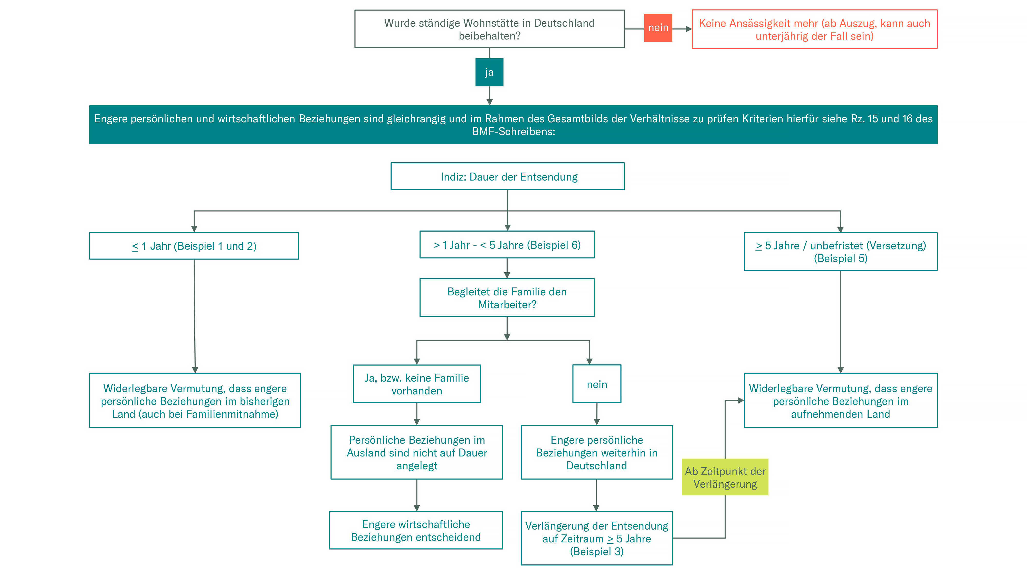 Ist der Mitarbeiter nur befristet im anderen Staat tätig und behält er die bisherige Wohnung bei, kann auch die Dauer des befristeten Aufenthalts im Tätigkeitsstaat ein Anhaltspunkt für die Gewichtung der persönlichen Interessen sein: Je länger ein Aufenthalt in einem Staat andauert, umso mehr kann davon ausgegangen werden, dass sich auch dort persönliche Beziehungen ergeben. Die Beispiele, die das BMF in das Schreiben auf­ge­nommen hat, lassen auf folgendes Prüfschema schließen: