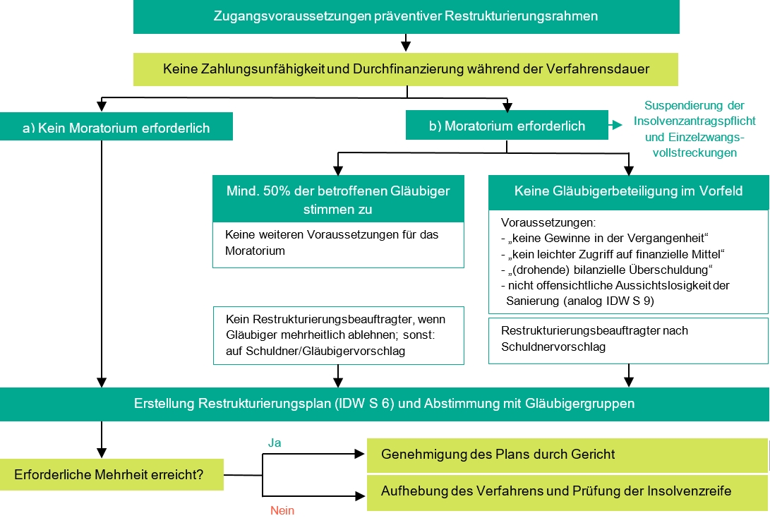 Je früher die Sanierung eines Unternehmens eingeleitet wird, desto besser sind auch die Aussichten auf einen Sanierungs­erfolg und es bestehen mehr Handlungs­alternativen. Eine erfolgreiche präventive Restrukturierung wirkt sich ebenso für die Gläubiger positiv aus, da i.d.R. höhere Realisierungsquoten der Forderungen entstehen als bei einem gerichtlichen Insolvenz­verfahren. In einem frühen Stadium wird ein Moratorium häufig nicht nötig sein, da alle Parteien zunächst eine außergerichtliche Sanierung anstreben. Demzufolge könnte das Sanierungs­konzept ohne Beteiligung eines Gerichts umgesetzt werden. Falls eine Mehrheit, jedoch nicht alle Gläubiger, dem Sanierungskonzept zustimmen, kommt der präventive Re­­struk­­turie­rungs­­rahmen zum Einsatz. Alleine die Option des Verfahrens sollte bei opponierenden Gläubigern einen Anreiz zur Kommunikation und ggf. Kooperation geben. Falls unter den Gläubigern kein Konsens entsteht, reicht das Unternehmen sein Sanierungs­­konzept mit den Abstimmungsergebnissen beim Gericht ein, das die Voraus­setzungen für die Über­stim­mung der opponierenden Gläubiger (ggfs. auch cross-class cram-down) prüft und den Plan in Kraft setzen kann.